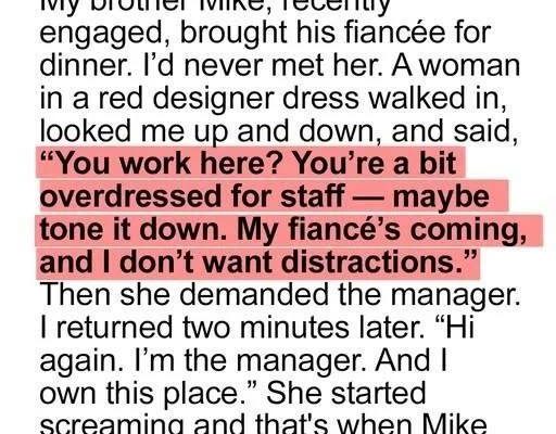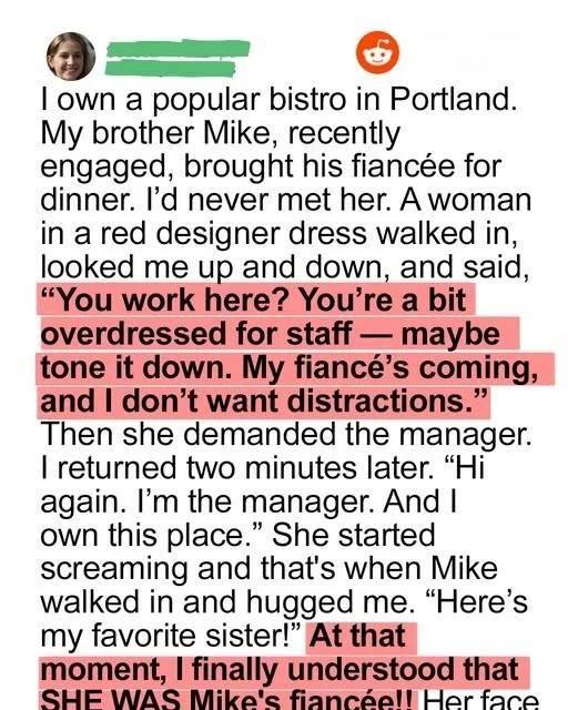 Her face drained of color as she realized who I was—not only the restaurant owner, but also her future sister-in-law. My brother quickly sensed the tension, and when he learned what had happened, he was deeply disappointed. His fiancée pulled me aside and apologized, explaining she carried insecurities from a past relationship and acted out of fear rather than judgment.