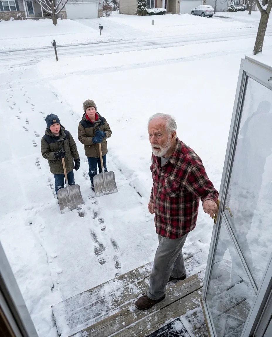 I stood there in my thermal shirt and old flannel pants, staring at two boys who looked like they had been blown onto my porch by the storm. The older one was maybe fifteen; the younger one couldn’t have been more than twelve. They had two shovels between them.