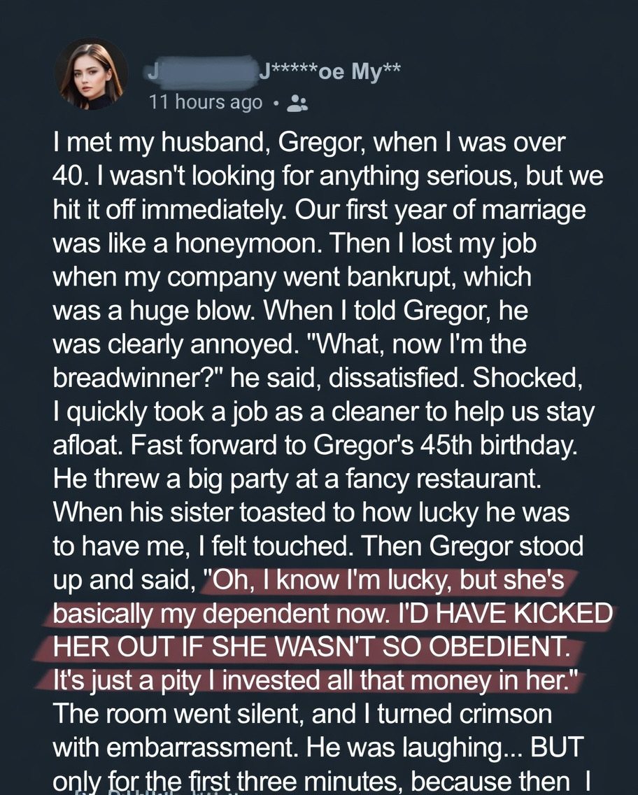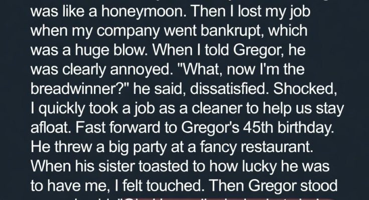 Months later, Gregor decided to host a lavish birthday celebration at an upscale restaurant. Surrounded by friends and family, the evening started warmly with laughter and heartfelt toasts. But when Gregor stood to speak, his “joke” caught everyone off guard.