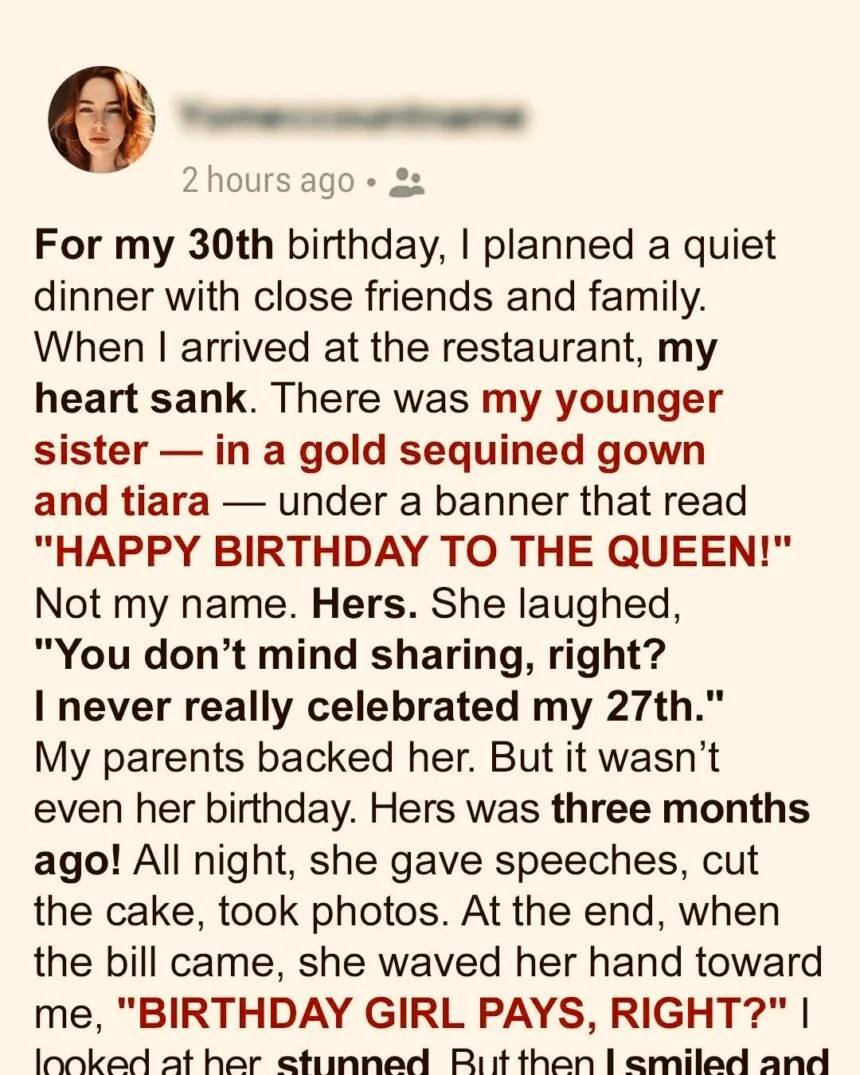 She specifically chose my birth date to hijack, and my party to turn it into hers! But no one seemed to care about it except me! All night, I sat stone-faced as my sister soaked up all the attention.