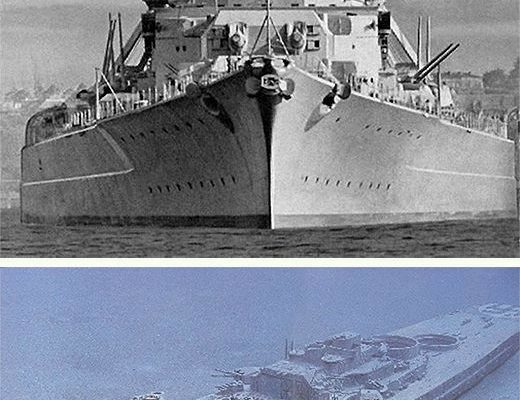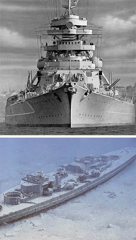 This, coupled with the fact the ship sank “stern first” and had no structural support to hold it in place, suggests the stern detached at the surface. In 1942 Prinz Eugen was also torpedoed in the stern, which subsequently collapsed. This prompted a strengthening of the stern structures on all German capital ships.