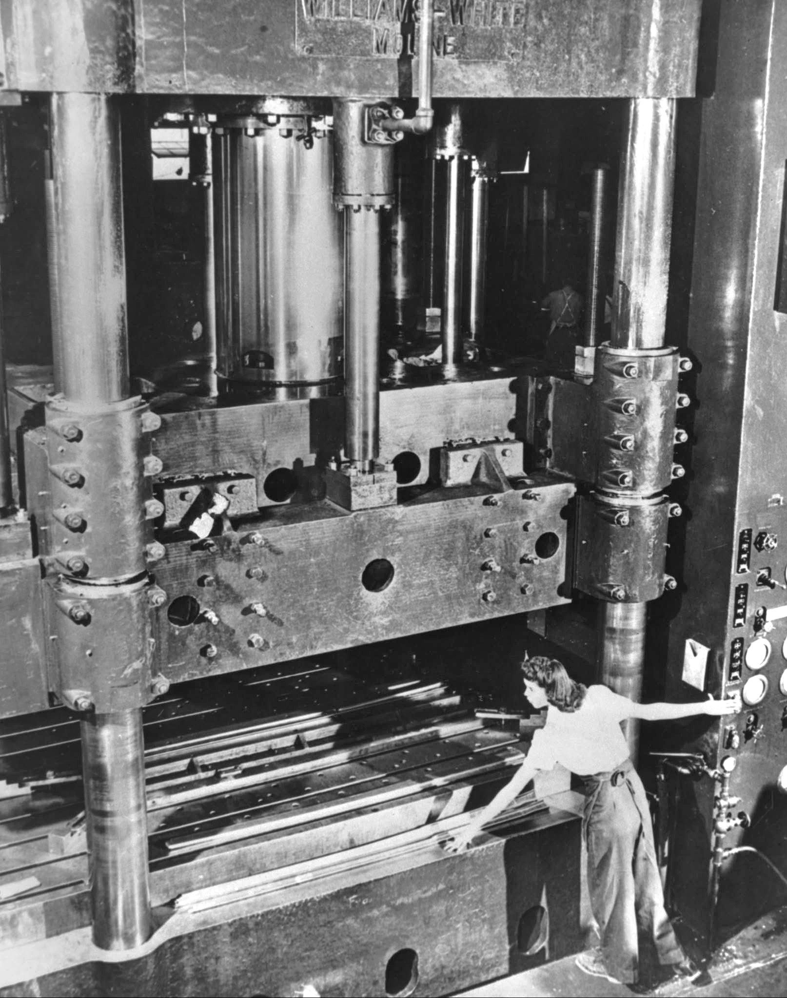 A North American Aviation employee places metal parts on masonite before sliding them under a hydraulic press at the plant in Inglewood, California. 1942.